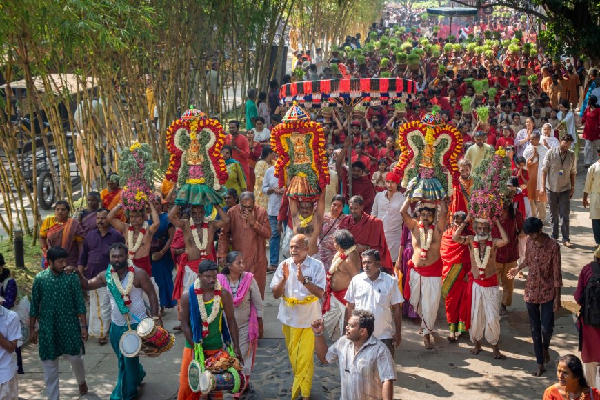 அந்த வகையில், இந்த ஆண்டு விழாவையொட்டி ஈஷாவைச் சுற்றியுள்ள கிராம மக்கள், பழங்குடியின மக்கள் மற்றும் வெளிநாட்டினர் எனப் பலதரப்பட்ட மக்கள் ஒன்றிணைந்து, முளைப்பாரியால் அலங்கரிக்கப்பட்ட தேவியின் திருவுருவத்தைப் பல்லக்கில் ஏந்தி ஊர்வலமாக வந்தனர்.